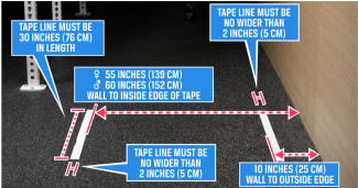 -Ring Row: The rings must be set so the bottom is 36 inches (approximately 91 centimeters) from the floor, and both the height and distance of the rings must remain consistent for all athletes in the heat. Each repetition begins with the athlete in a rigid, straight-line position from shoulders to heels, arms fully extended, heels planted on the tape line, and rings positioned above the shoulders. During the pull phase, the athlete must draw their chest to the rings until clear contact is made between the clavicle and sternum, with elbows passing the torso, while maintaining a straight body without using momentum. The descent requires a controlled return to full arm extension with proper alignment before starting the next rep. A repetition only counts if both chest contact and full extension are achieved. Movements involving incomplete extension, lack of contact, use of momentum, body bending, or foot movement are considered no-reps, and judges should verify proper form, alignment, and consistency throughout.